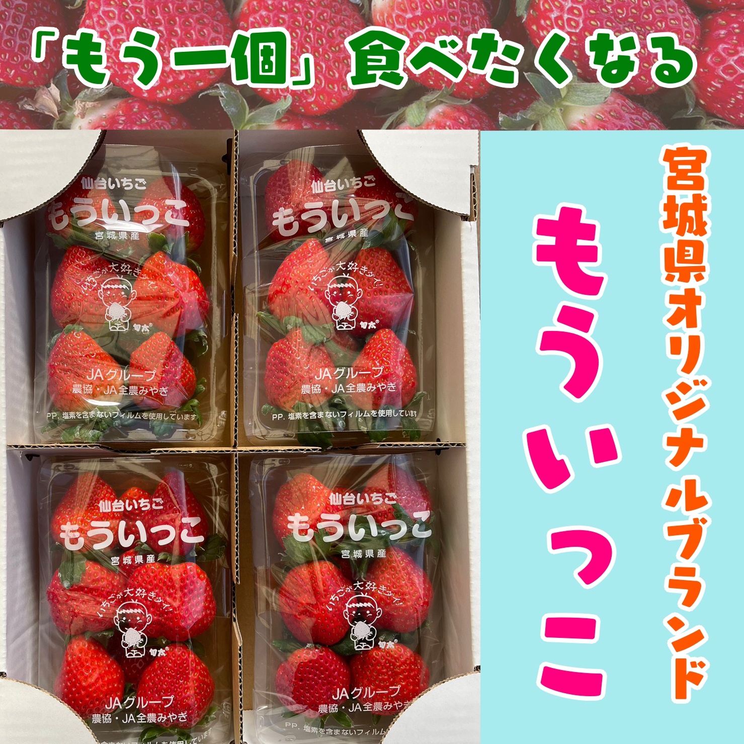 宮城県登米市米山町で育ったいちごです。寒い地域でも美味しく育つ宮城県オリジナル品種「もういっこ」です。 完熟した摘みたてのいちご「もういっこ」を4パックにしてお届け。12月~3月の寒い時期だからこそ美味しいいちごをお届けします。